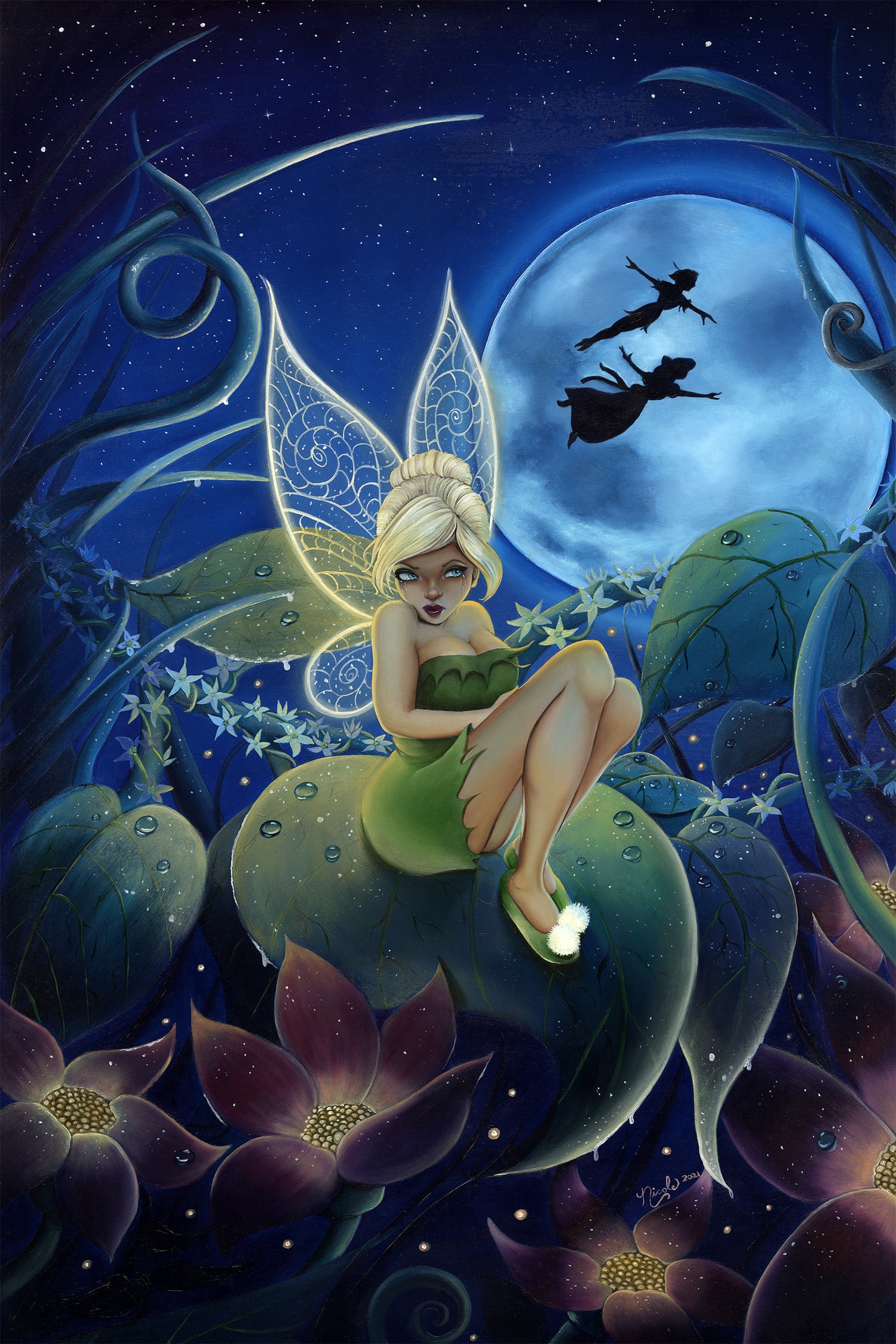 Never features the fairy Tinkerbell from the classic book Peter Pan by J. M. Barrie, Tink is sulking as Peter and Wendy fly overhead, silhouettes showing in the moon. The original is a 20x30" Oil Painting on Illustration Board.