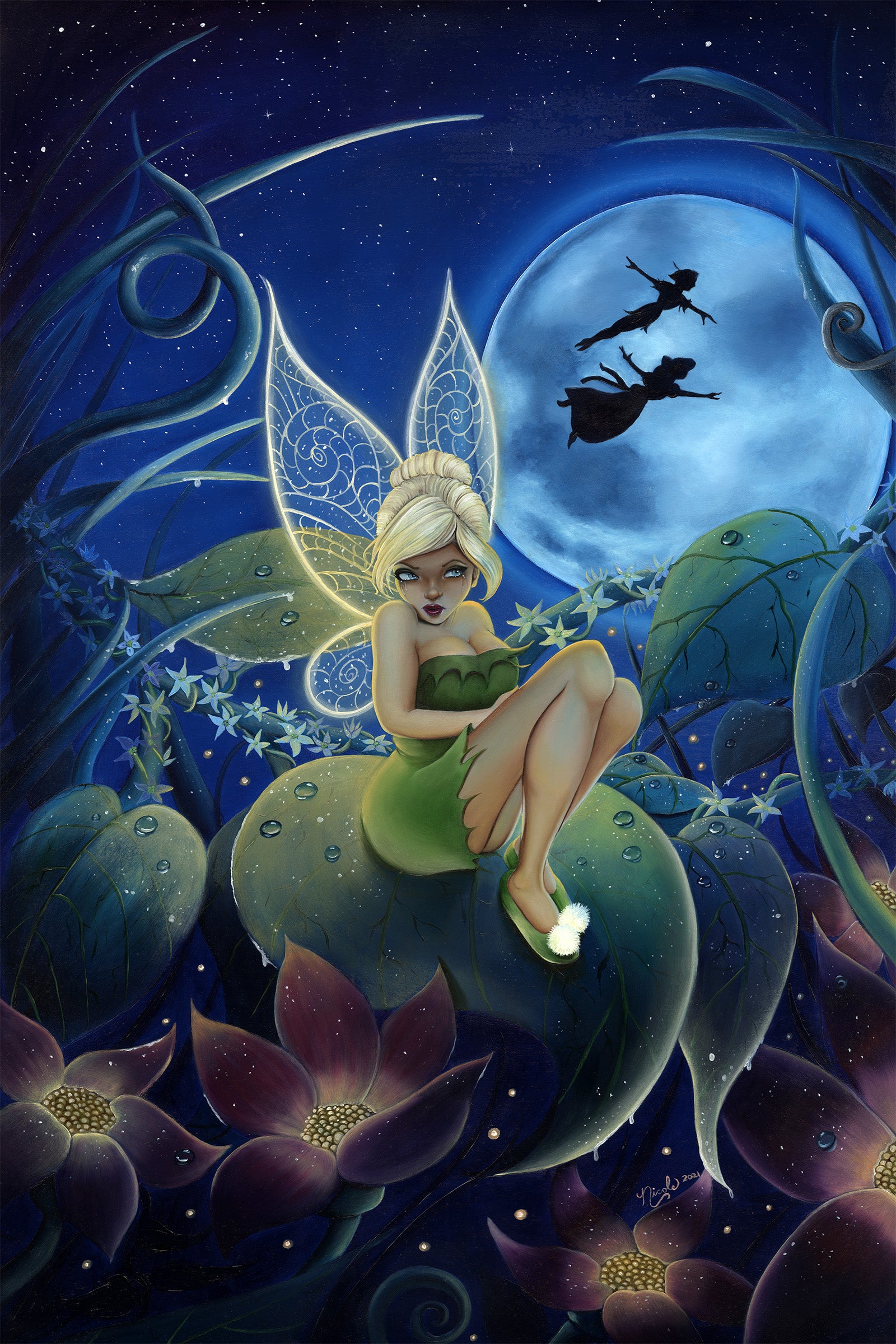 Never is an oil painting of the fairy Tinkerbell from the classic book Peter Pan by J. M. Barrie, Tink is sulking as Peter and Wendy fly overhead, silhouettes showing in the moon. The original is an 20x30" Oil Painting on Illustration Board
